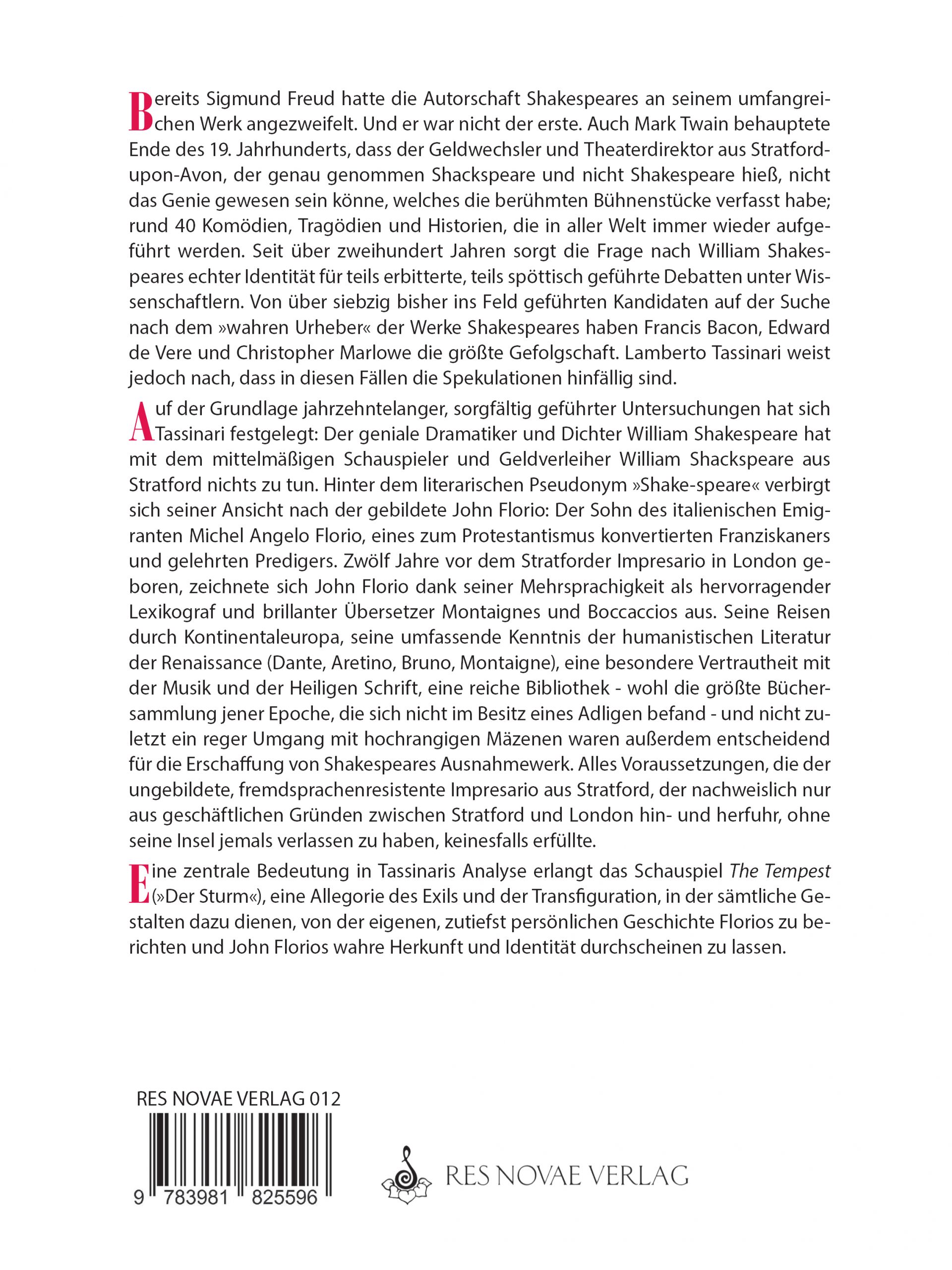 Bereits Sigmund Freud hatte die Autorschaft Shakespeares an seinem umfangreichen Werk angezweifelt. Und er war nicht der Erste. Auch Mark Twain behauptete Ende des 19. Jahrhunderts, dass der Geldwechsler und Theaterdirektor aus Stratford-upon-Avon, der genau genommen Shackspeare und nicht Shakespeare hieß, nicht das Genie gewesen sein könne, welches die berühmten Bühnenstücke verfasst habe; rund 40 Komödien, Tragödien und Historien, die in aller Welt immer wieder aufgeführt werden. Seit über zweihundert Jahren sorgt die Frage nach William Shakespeares echter Identität für teils erbitterte, teils spöttisch geführte Debatten unter Wissenschaftlern. Von über siebzig bisher ins Feld geführten Kandidaten auf der Suche nach dem „wahren Urheber“ der Werke Shakespeares haben Francis Bacon, Edward de Vere und Christopher Marlowe die größte Gefolgschaft. Lamberto Tassinari weist jedoch nach, dass in diesen Fällen die Spekulationen hinfällig sind.
